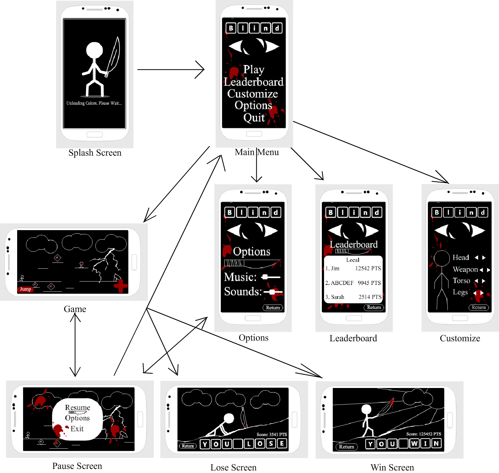 Blind is a design concept of a 2D side scroller developed with mobile devices in mind. In our Interaction, Immersion, and Media Interface class, we were tasked with designing a mobile application.